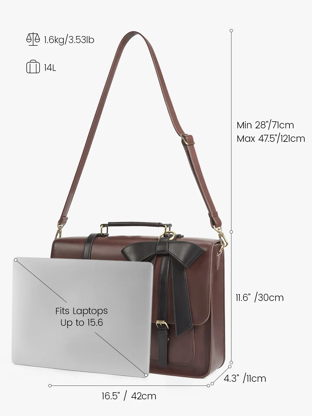 The Ecosusi Classic Bow Briefcase harmoniously blends classic elegance with a modern touch. Its vintage pure color, complemented by gold-tone metal details and a detachable bow decoration, exudes timeless style. Additionally, it now offers the added functionality of being a versatile backpack with removable and adjustable shoulder straps. With multiple compartments, this vegan vintage bag for women allows for effortless organization whether carried by hand or worn over the shoulder.